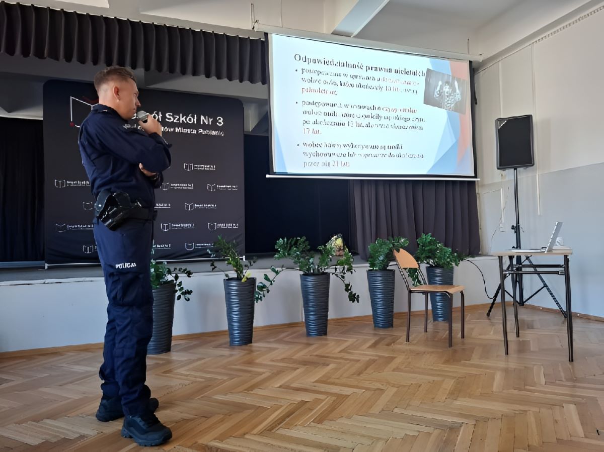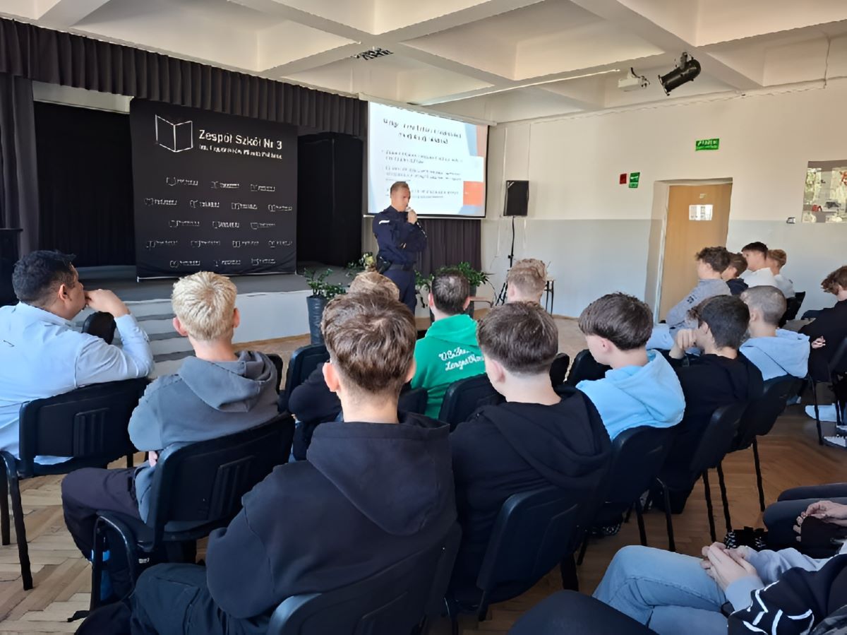 W ramach obchodów Tygodnia Przeciwdziałania Przemocy Rówieśniczej aspirant Łukasz Pierzyński z Zespołu ds. Nieletnich i Patologii Komendy Powiatowej Policji w Pabianicach odwiedził uczniów z Zespołu Szkół Nr 3 im. Legionistów Miasta Pabianic. Podczas spotkania funkcjonariusz informował zgromadzoną młodzież o tym, jak budować kulturę szacunku, jak reagować na sytuacje przemocy oraz jak wspierać ofiary i promować pozytywne relacje. Mundurowy przypomniał znaczenie słów tolerancja i szacunek, mówił czym jest przemoc rówieśnicza i jakie konsekwencje się z nią wiążą, poruszając tym samym kwestię odpowiedzialności prawnej nieletnich.