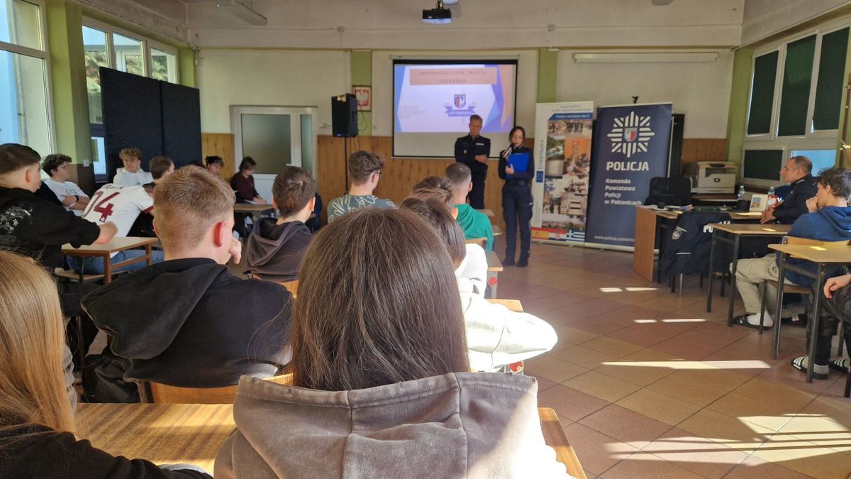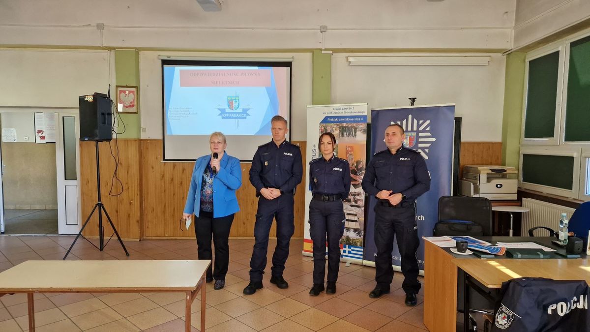 Na początku spotkania głos zabrała Eliza Matusiak Dyrektor Szkoły, która podkreśliła znaczenie profilaktyki i edukacji prawnej wśród młodzieży. W wydarzeniu wziął udział młodszy inspektor Sławomir Kłos Zastępca Komendanta Powiatowego Policji w Pabianicach, a poprowadził je aspirant Łukasz Pierzyński Kierownik Zespołu ds. Nieletnich i Patologii.
