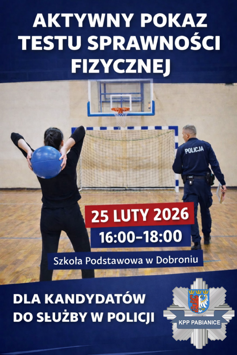 25 lutego 2026 roku policjanci z pabianickiej komendy przygotują aktywny pokaz testu sprawnościowego dla kandydatów do służby w Policji. Wydarzenie odbędzie się w godzinach 16.00-18.00, w hali sportowej Szkoły Podstawowej im. Jana Pawła II w Dobroniu.