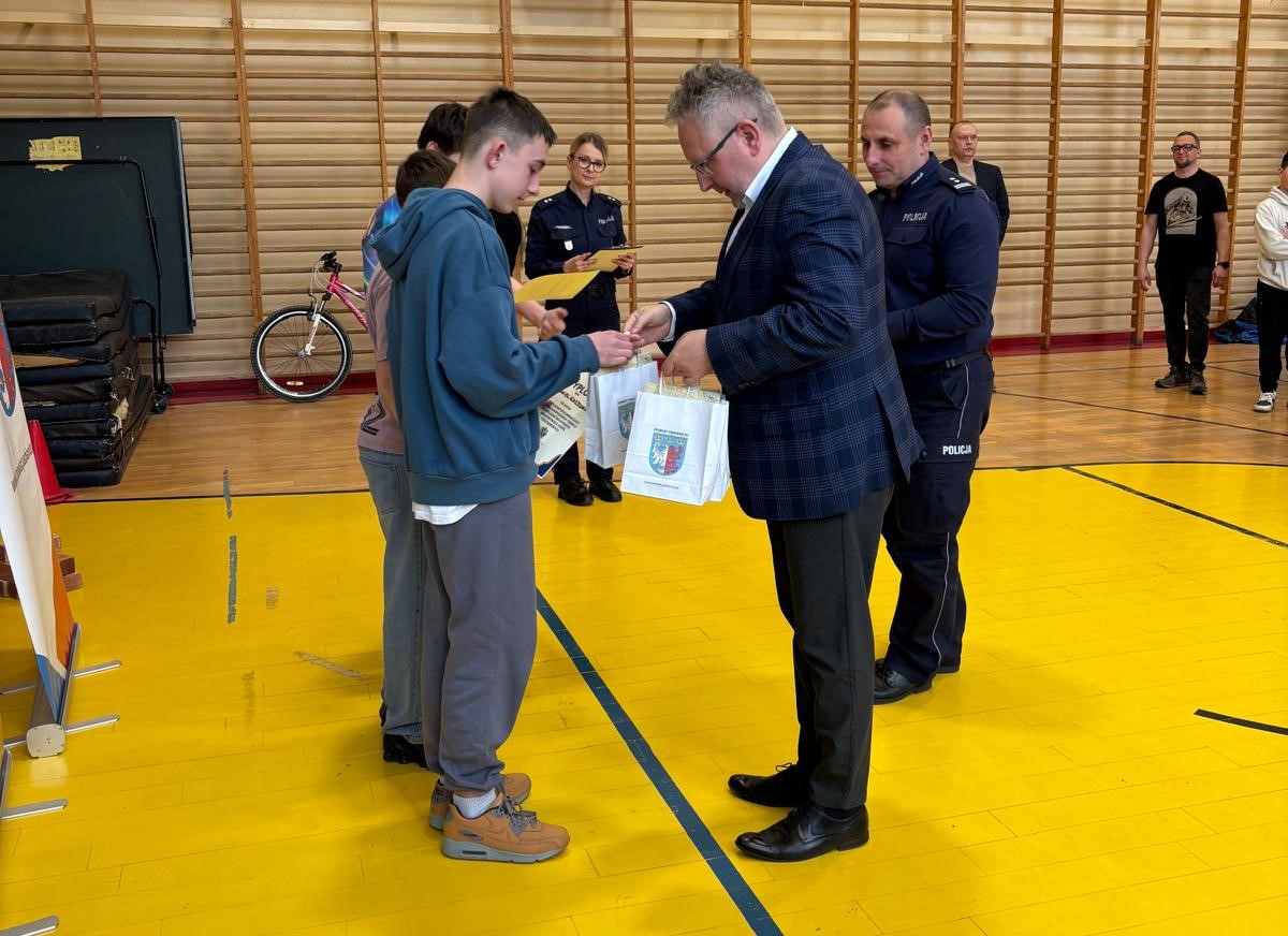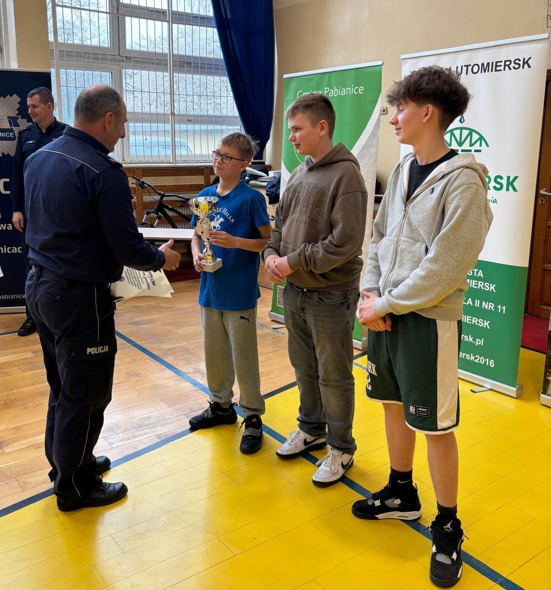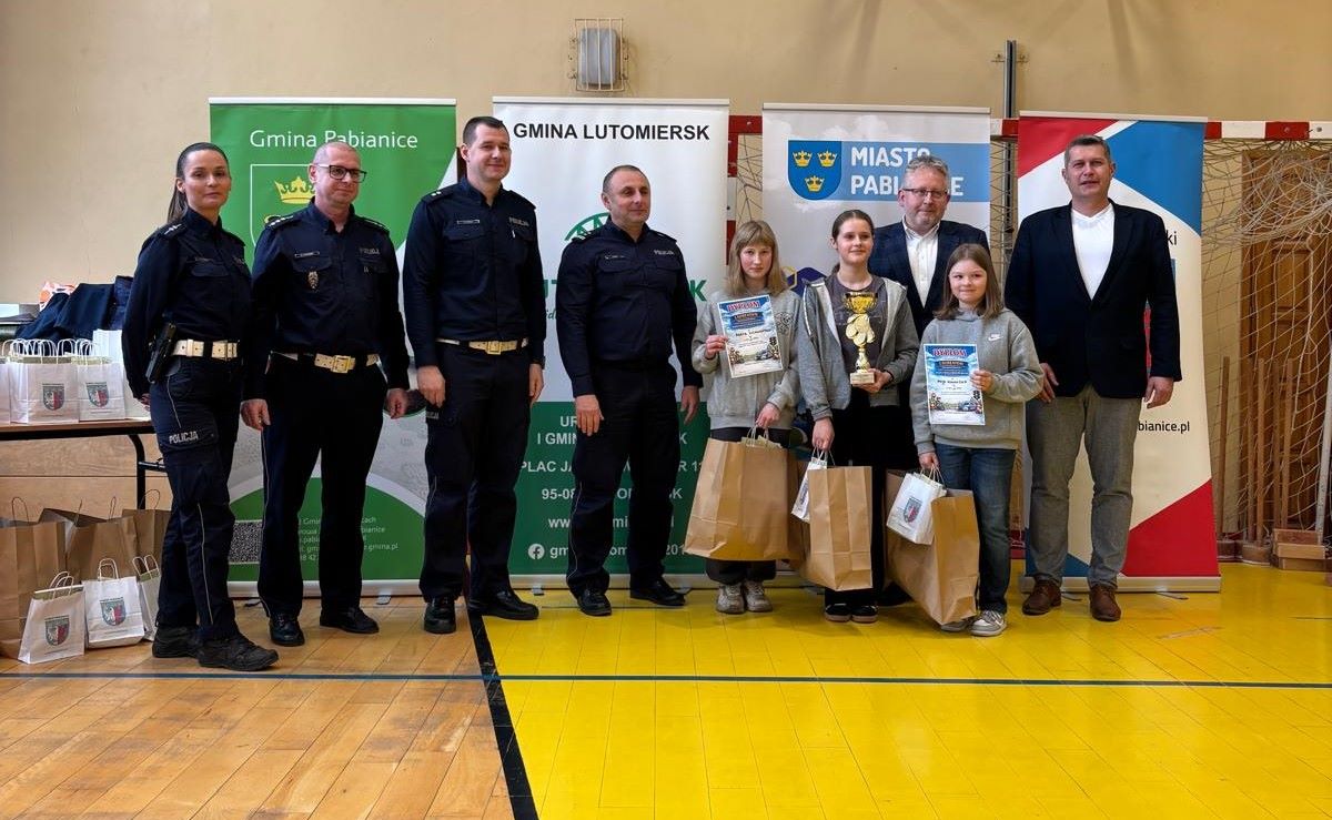 Puchary, pamiątkowe dyplomy wręczył laureatom mł. insp. Sławomir Kłos Zastępca Komendanta Powiatowego Policji w Pabianicach. Natomiast nagrody i upominki przekazali uczestnikom Turnieju Jarosław Dębski Burmistrz Miasta i Gminy Lutomiersk oraz Marcin Wieczorek Wójt Gminy Pabianice.