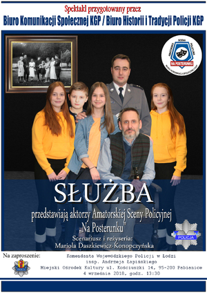 Wspaniałą podróż przez historię polskiej policji wystawiono na deskach Miejskiego Ośrodka Kultury w Pabianicach. Aktorzy Amatorskiej Sceny Policyjnej ,,Na Posterunku” wystąpili ze spektaklem pt. ,,Służba”. Wyjątkowe widowisko wyreżyserowała Mariola Daszkiewicz - Konopczyńska z Biura Komunikacji Społecznej Komendy Głównej Policji. Ta wyjątkowa sztuka to historia rodziny, w której wszyscy mężczyźni nosili mundur i byli z tego dumni.