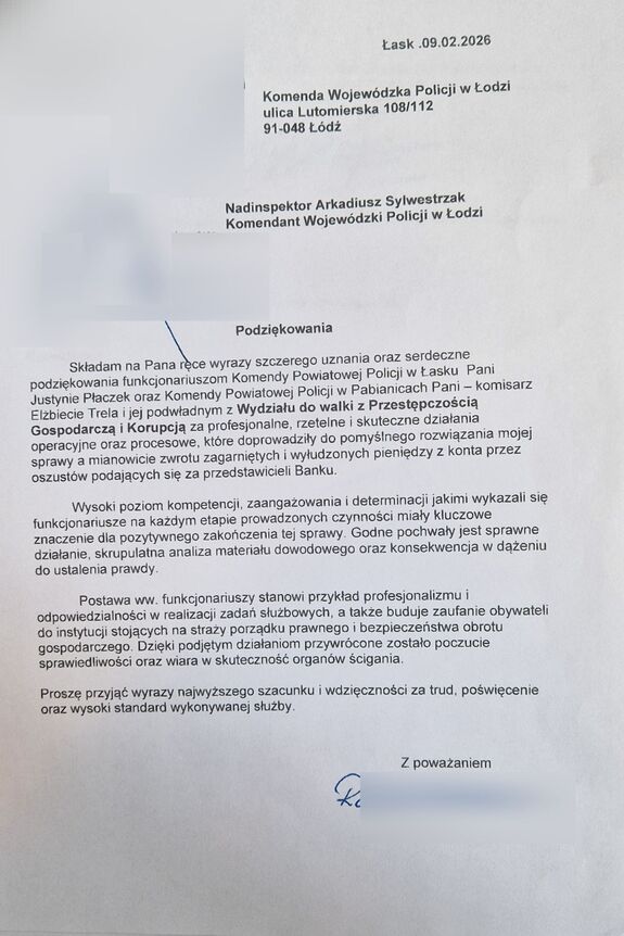 Dzięki sprawnej współpracy i zaangażowaniu funkcjonariuszy Komendy Powiatowej Policji w Pabianicach oraz Komendy Powiatowej Policji w Łasku udało się skutecznie rozwiązać sprawę oszustwa finansowego i odzyskać utracone przez pokrzywdzonego środki. Profesjonalizm, skrupulatność i determinacja policjantów zostały docenione w postaci oficjalnych podziękowań złożonych na ręce nadinspektora Arkadiusza Sylwestrzaka Komendanta Wojewódzkiego Policji w Łodzi.